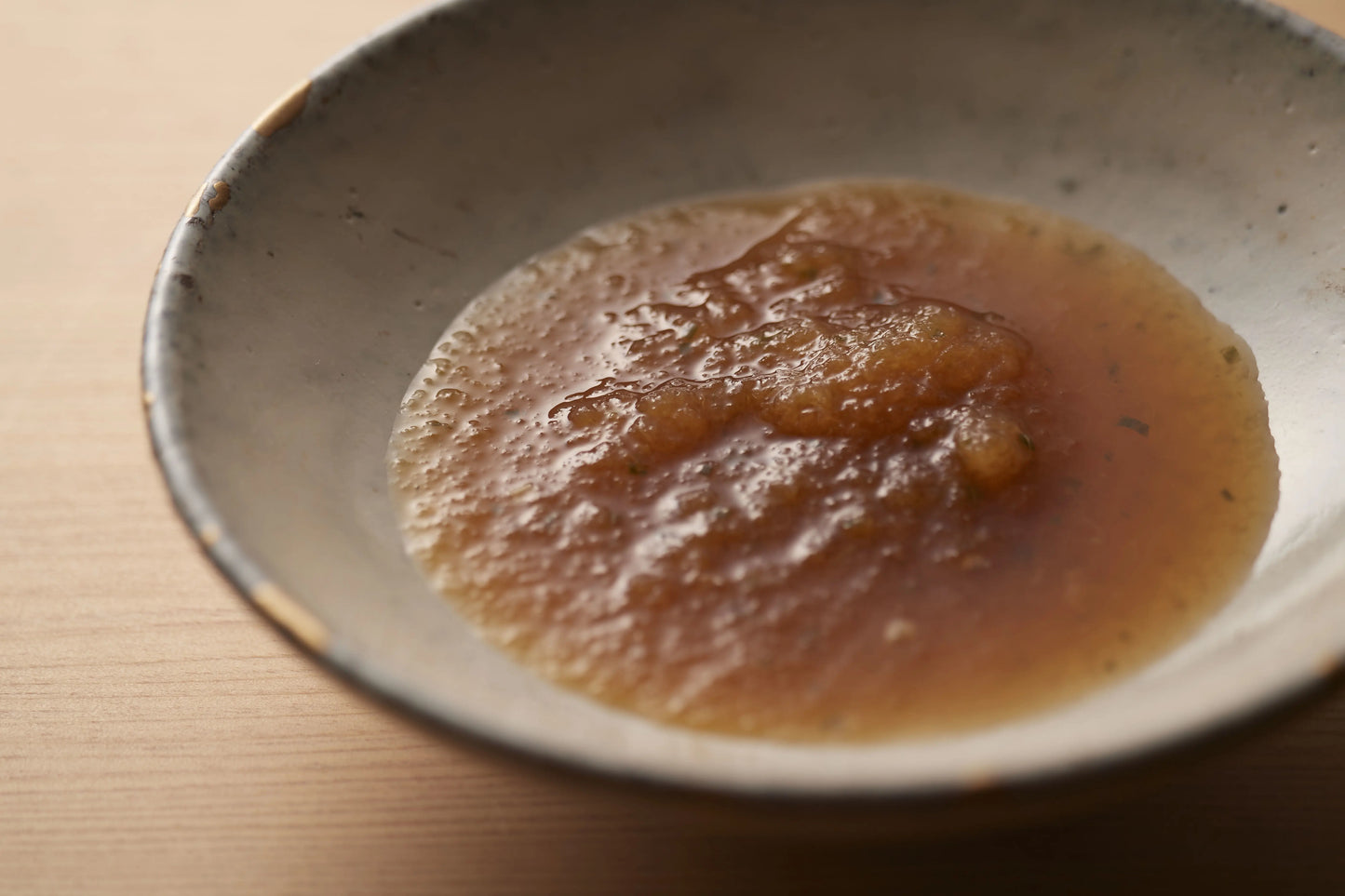 すりおろした大根と細かく叩いたねぎを合わせ、そこにお醤油とだいだいの果汁を加えました。ふじ居のおろしぽん酢です。焼き魚に、しゃぶしゃぶしたお肉に、サラダのドレッシングにと重宝いたします。