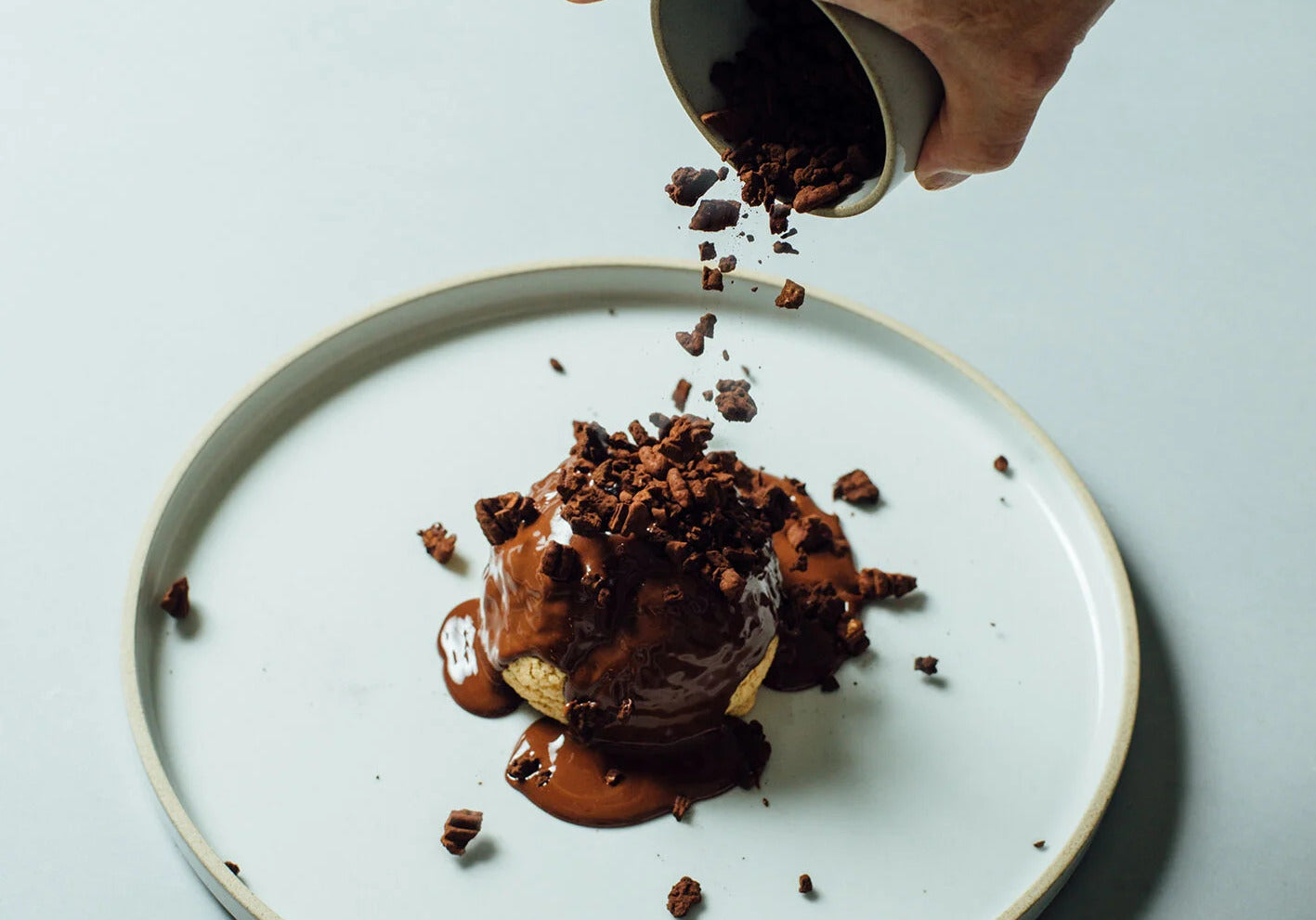 3 プロフィットロールにチョコレートソースをかけ、 カカオクロッカンをふりかけます。