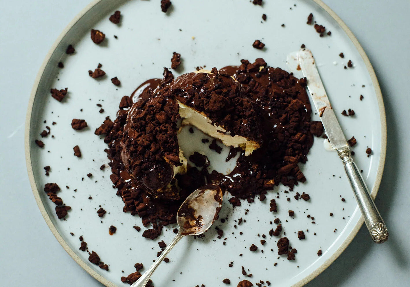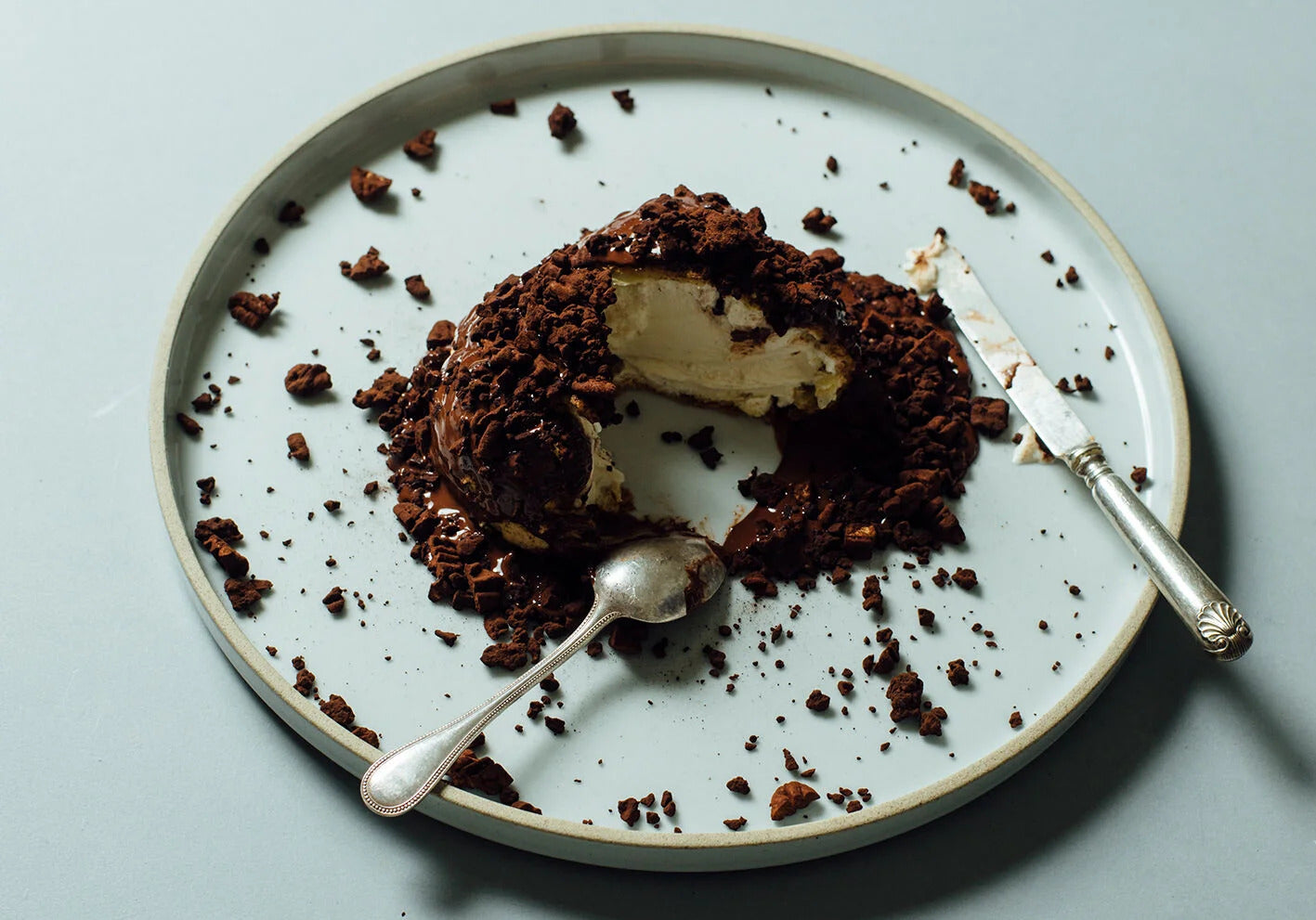 ヴァローナのイランカをつかった温かいショコラノワールのソースをたっぷりとかけ、Chaud-froid(温―冷)のおいしさ、とろける食感とクロッカンの心地の良い歯ざわりをお楽しみください。