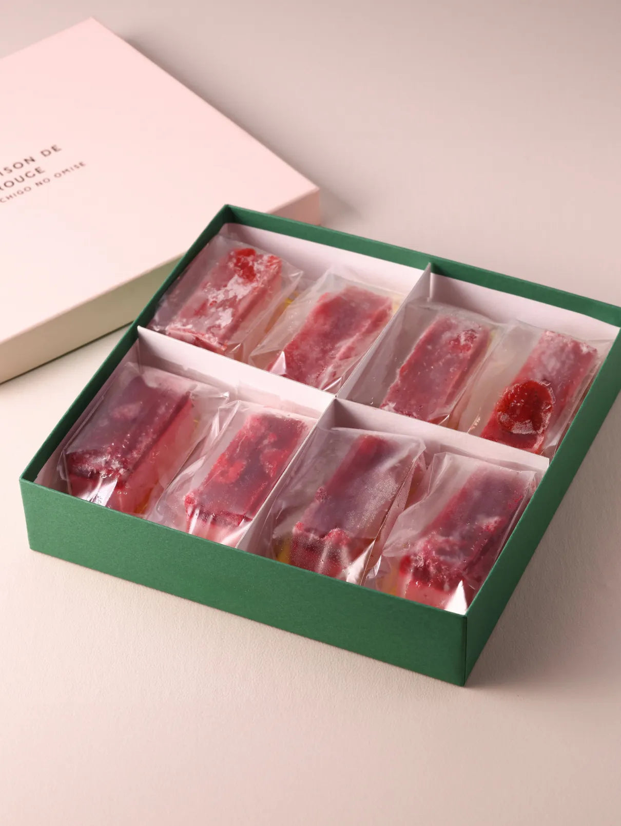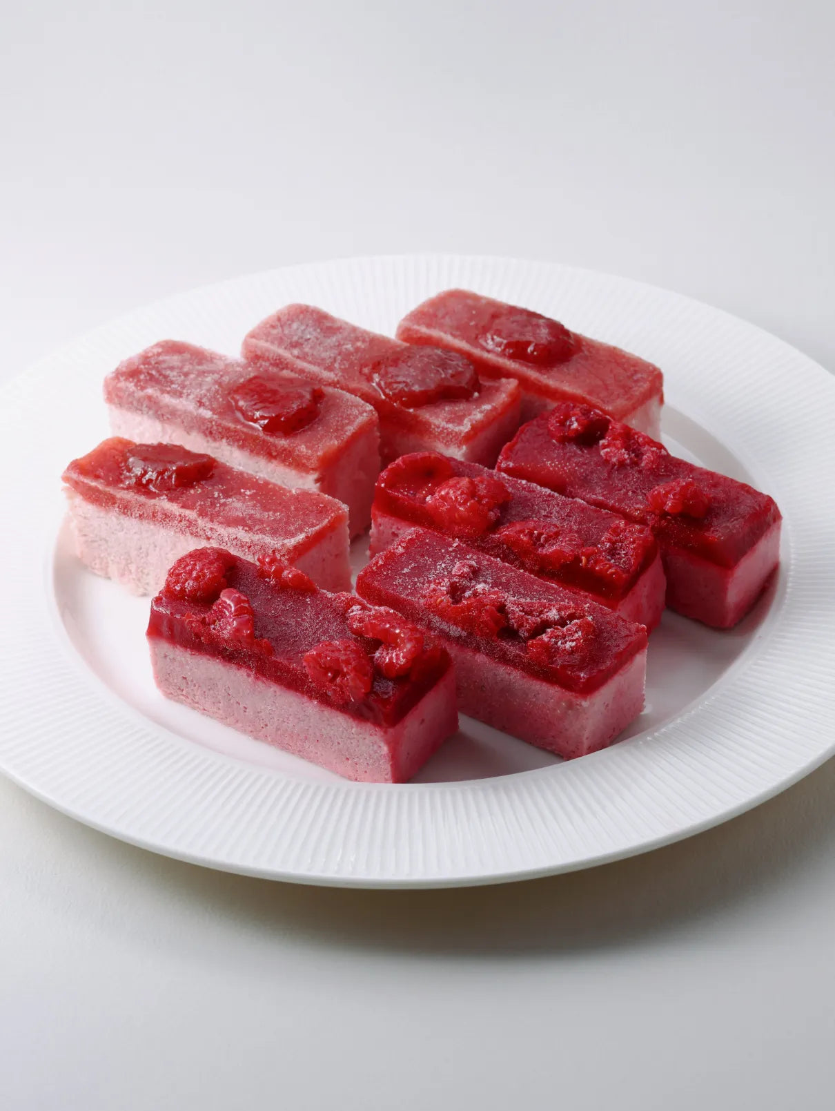 メゾン・ド・フルージュ三条店で人気の『生苺のチーズケーキ』をベースに、苺果汁と苺の果実、木苺&白桃果汁と木苺の果実を組み合わせて、ひんやり冷たい上品な味わいのフローズンデザートに仕立てました。