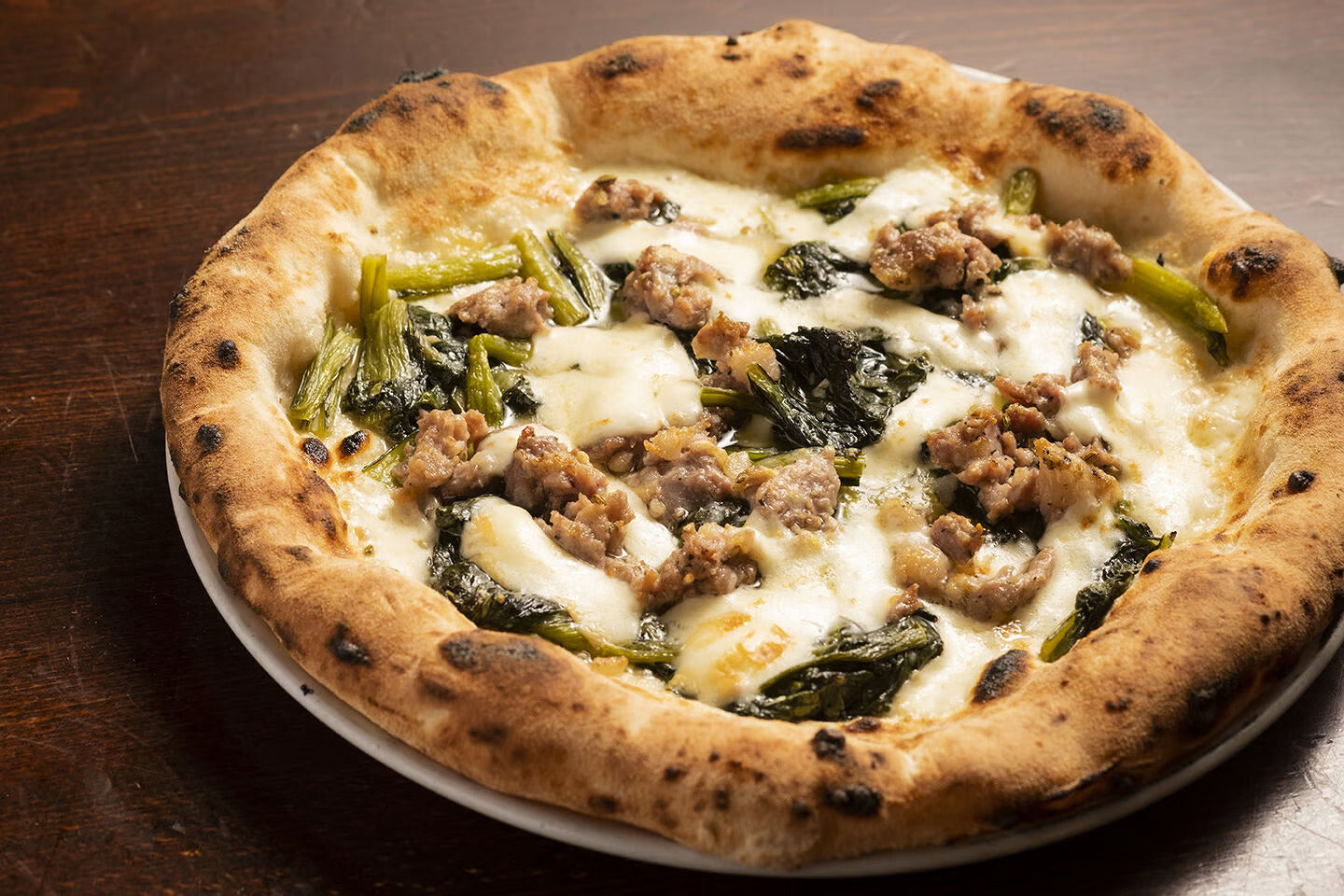 地元練馬産の青菜、自家製の粗挽き豚のジューシーサルシッチャ、燻製モッツアレラのピザ